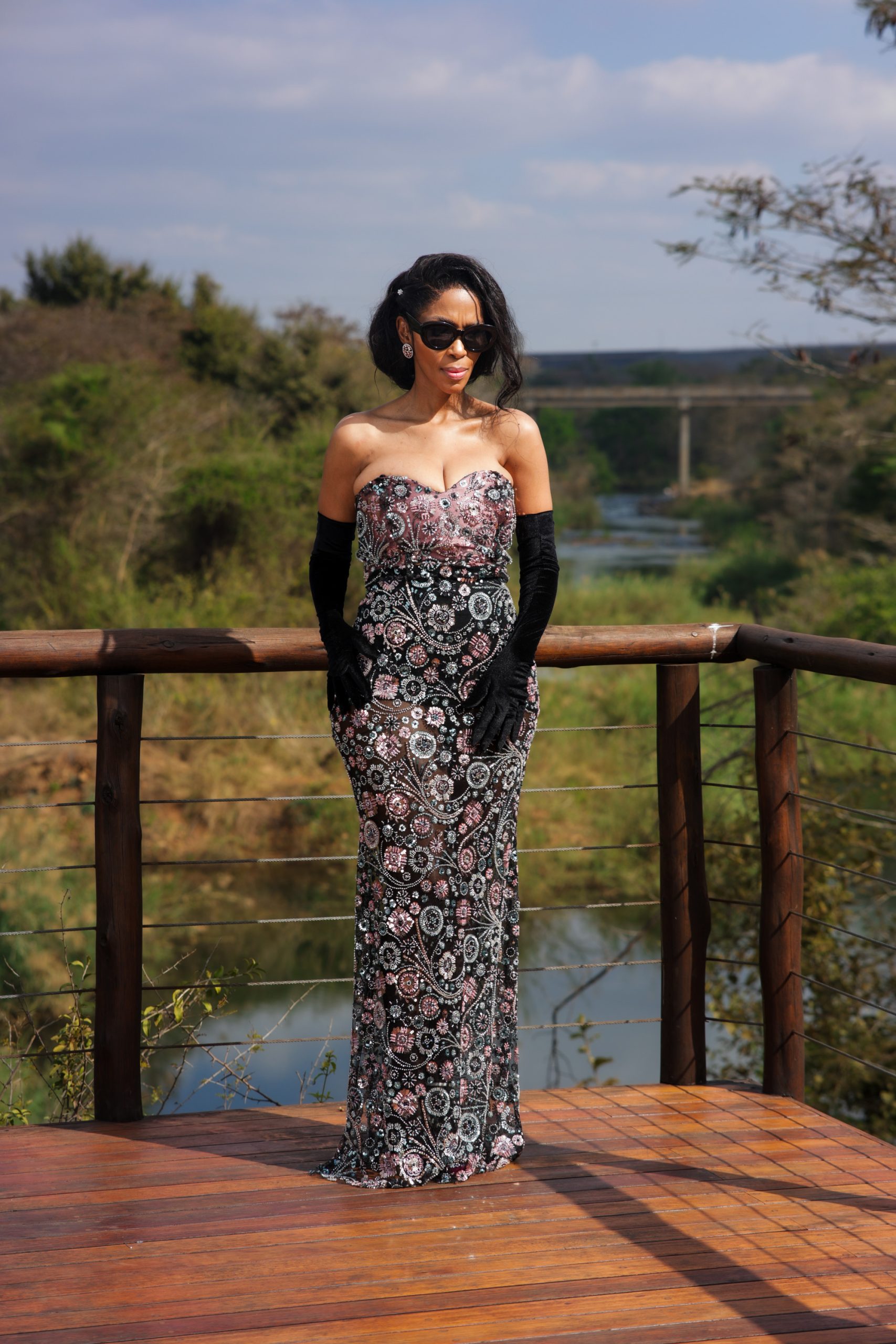 Vintage lace pencil dress with detailed crystal balls, paired with full long length velvet gloves